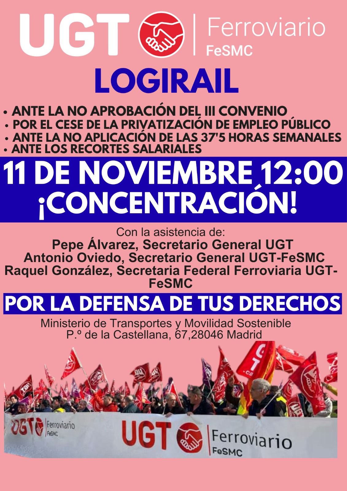 UGT ha convocado una concentración masiva el martes 11 de noviembre a las 12:00 ante la sede del Ministerio de Transportes y Movilidad Sostenible ( P.º de la Castellana, 67, Madrid) por la gravísima situación que están sufriendo las personas trabajadoras de LogiRAIL.